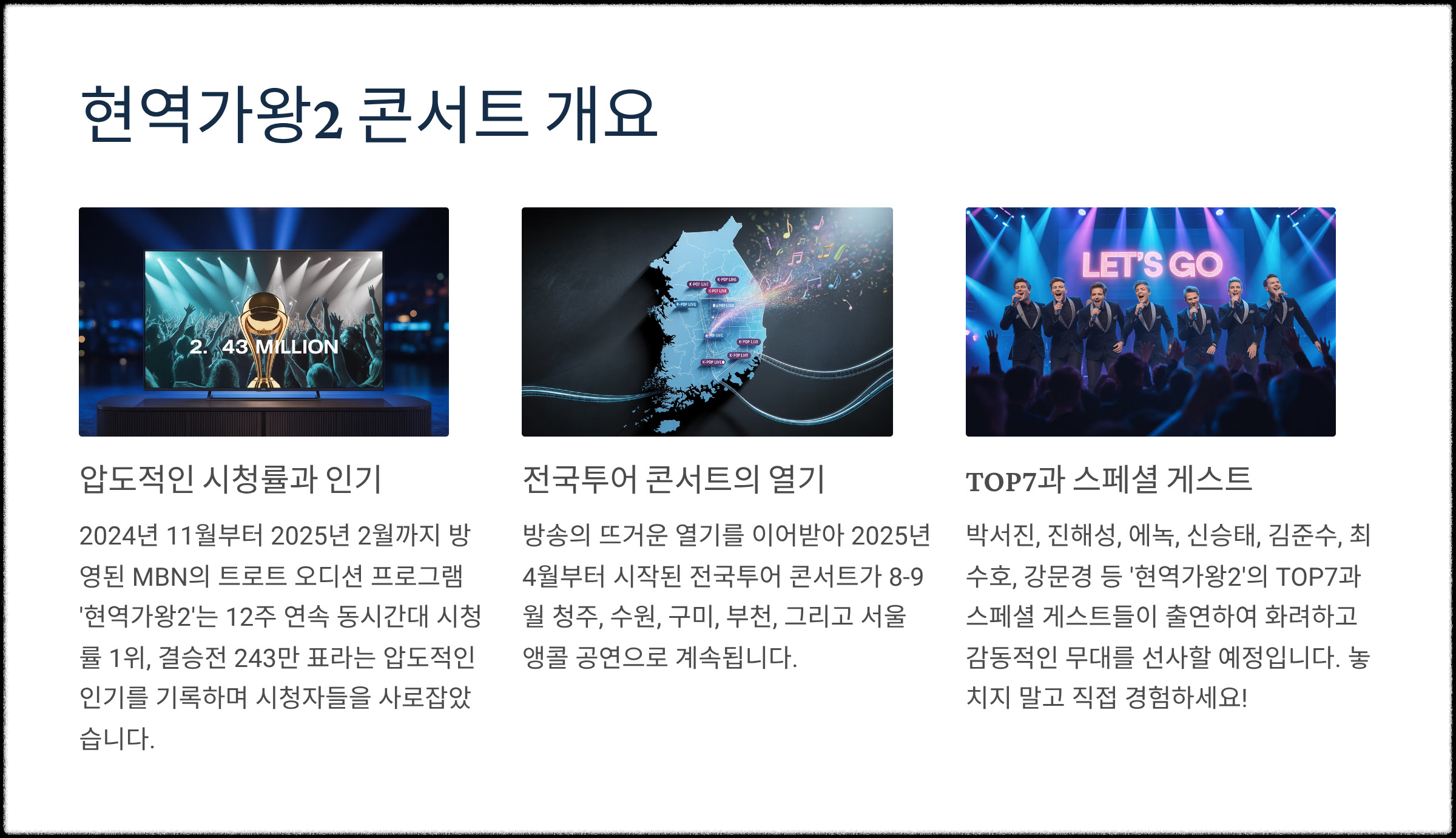 특히 청주, 수원, 구미, 부천, 그리고 서울 앵콜 공연은 트로트 팬들의 뜨거운 관심을 받고 있습니다. 본 포스팅에서는 이들 지역의 공연 일정, 티켓 예매 방법, 꿀팁 등을 상세히 정리해 드리겠습니다.