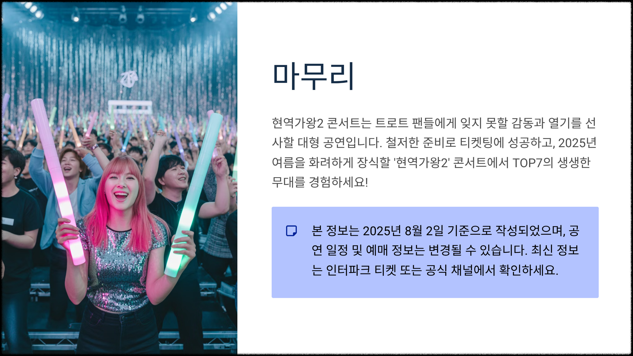 더 궁금한 사항이 있다면 인터파크 티켓 고객센터(1544-1555)로 문의하거나, 공식 웹사이트에서 최신 정보를 확인하세요. 트로트의 열기를 함께 즐기며, 2025년 여름을 화려하게 장식할 ‘현역가왕2’ 콘서트에 많은 관심 부탁드립니다!