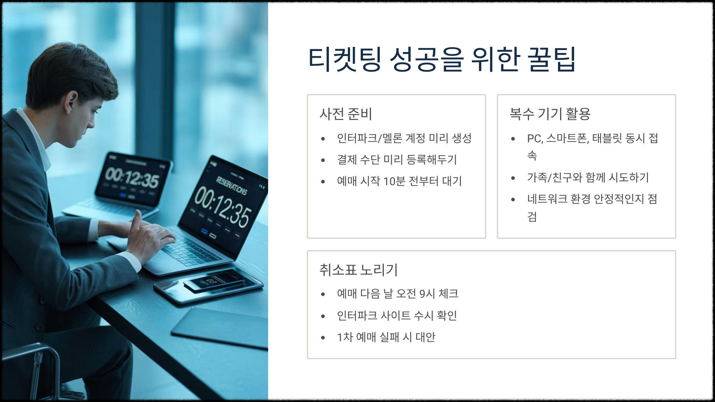 - 좌석 선택 후 결제(카드, 무통장 입금 등)를 완료합니다. 무통장 입금은 서버 과부하를 줄이는 데 유리합니다.