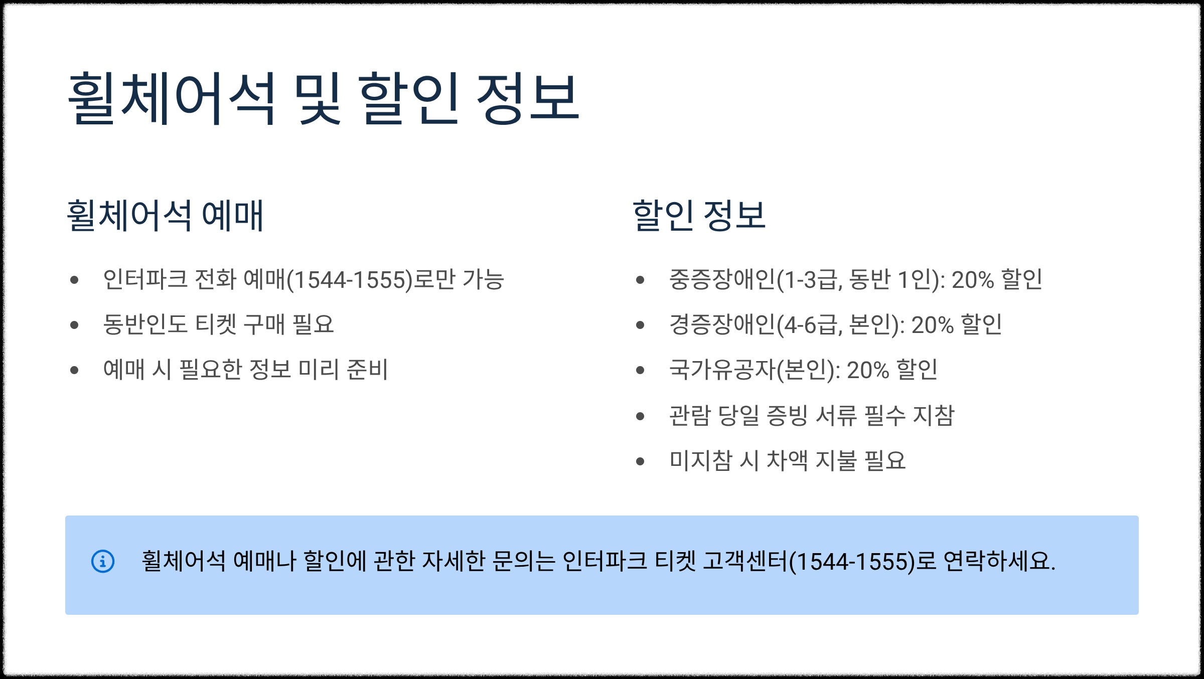- 중증장애인(1~3급, 동반 1인), 경증장애인(4~6급, 본인), 국가유공자(본인)는 20% 할인 적용. 관람 당일 증빙 서류를 제시해야 하며, 미지참 시 차액 지불이 필요합니다.