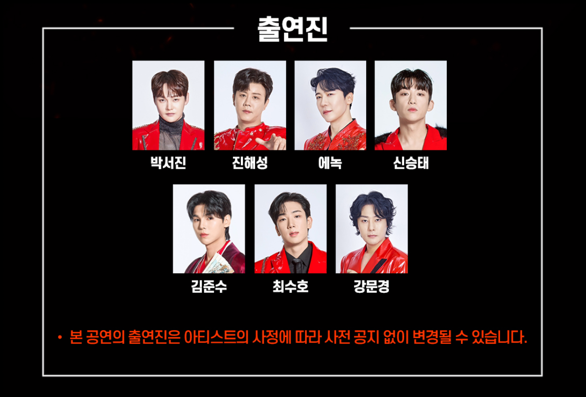 A: 출연진은 공연별로 다를 수 있으며, 주최사 사정에 따라 사전 공지 없이 변경될 수 있습니다. 공식 채널에서 최신 라인업을 확인하세요.