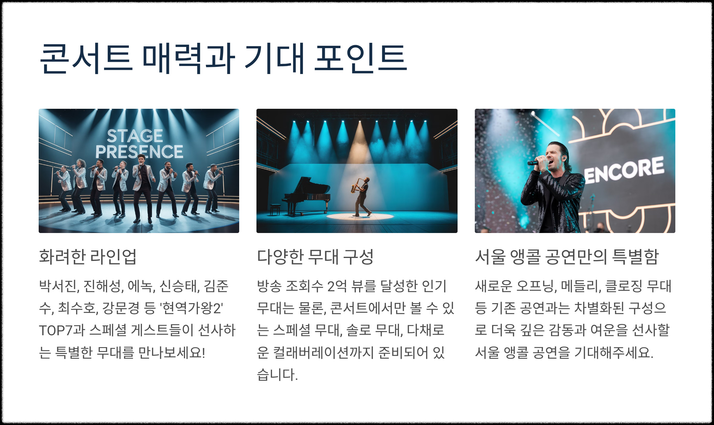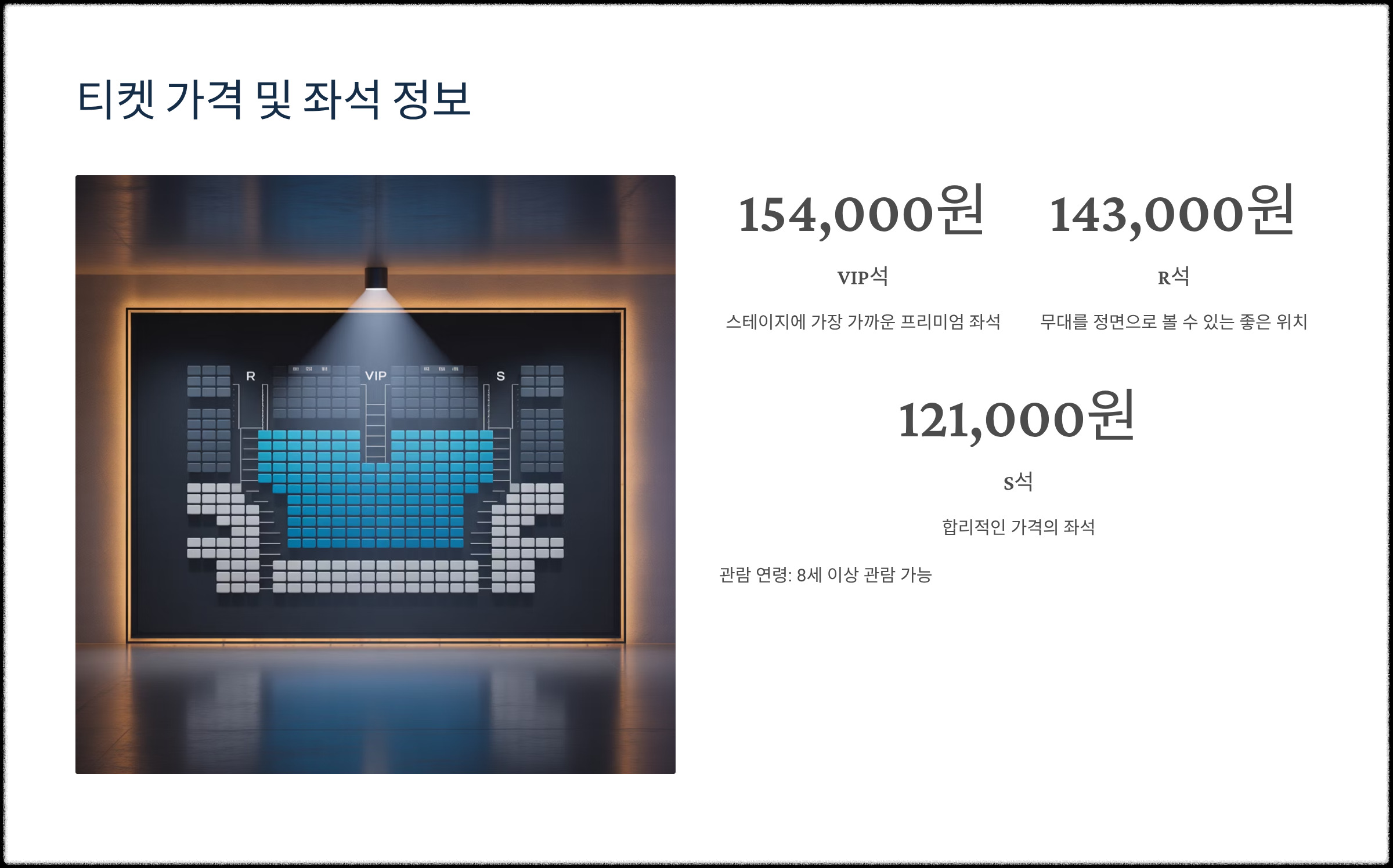 - 앵콜 공연의 특별함: 서울 앵콜 공연은 새로운 오프닝, 메들리, 클로징 무대로 구성되어 기존 공연과 차별화된 감동을 선사합니다.