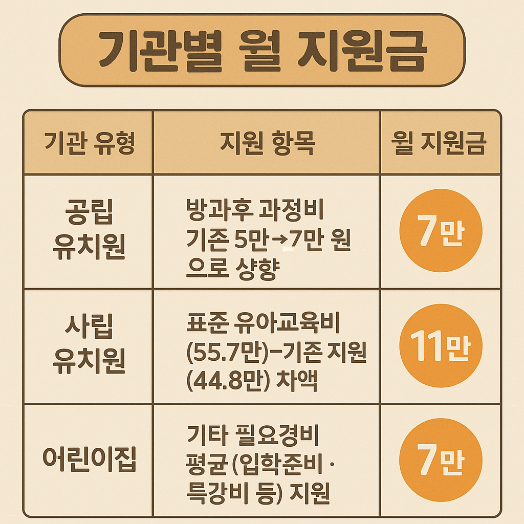 | 공립 유치원 | 방과후 과정비 기존 5만→7만 원으로 상향 | 7만 원 |